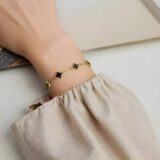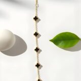 Featuring five exquisitely crafted black clover charms set against a radiant gold-plated chain, this piece offers a striking contrast that defines modern class. Its minimalist yet bold aesthetic makes it a versatile accessory for both office wear and evening parties. Durable, skin-friendly, and adjustable, it is the perfect lucky charm to elevate your daily style with a sophisticated floral touch.