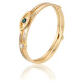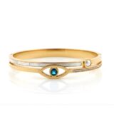Elevate your jewelry game with the Evil Eye Bangle, a perfect blend of ancient symbolism and contemporary fashion. This exquisite piece features a striking azure-blue crystal at its center, meticulously framed by a shimmering mother-of-pearl inlay and a delicate white pearl accent. The bangle’s unique layered design is adorned with precision-set stones that capture the light beautifully. Crafted from high-quality material with a radiant gold-toned finish, it is designed for durability and a premium feel. Whether worn alone as a statement piece or stacked with other bracelets, this bangle is a meaningful addition to your collection, symbolizing protection, luck, and timeless elegance.
