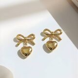 Charming 18k gold-plated bow earrings with a puffy heart drop, featuring an anti-tarnish finish for long-lasting, romantic elegance.